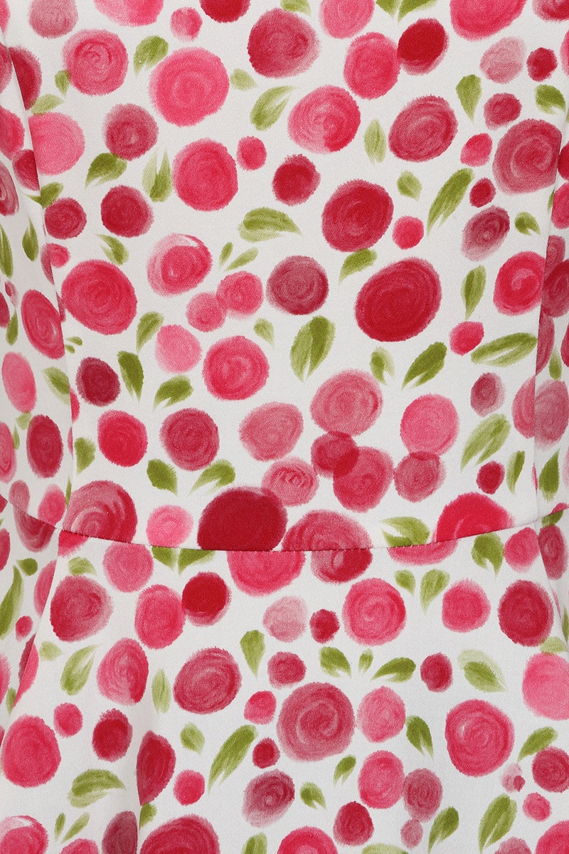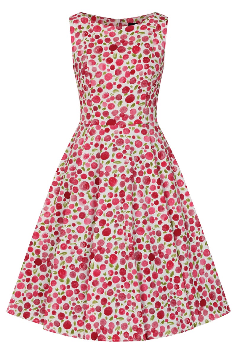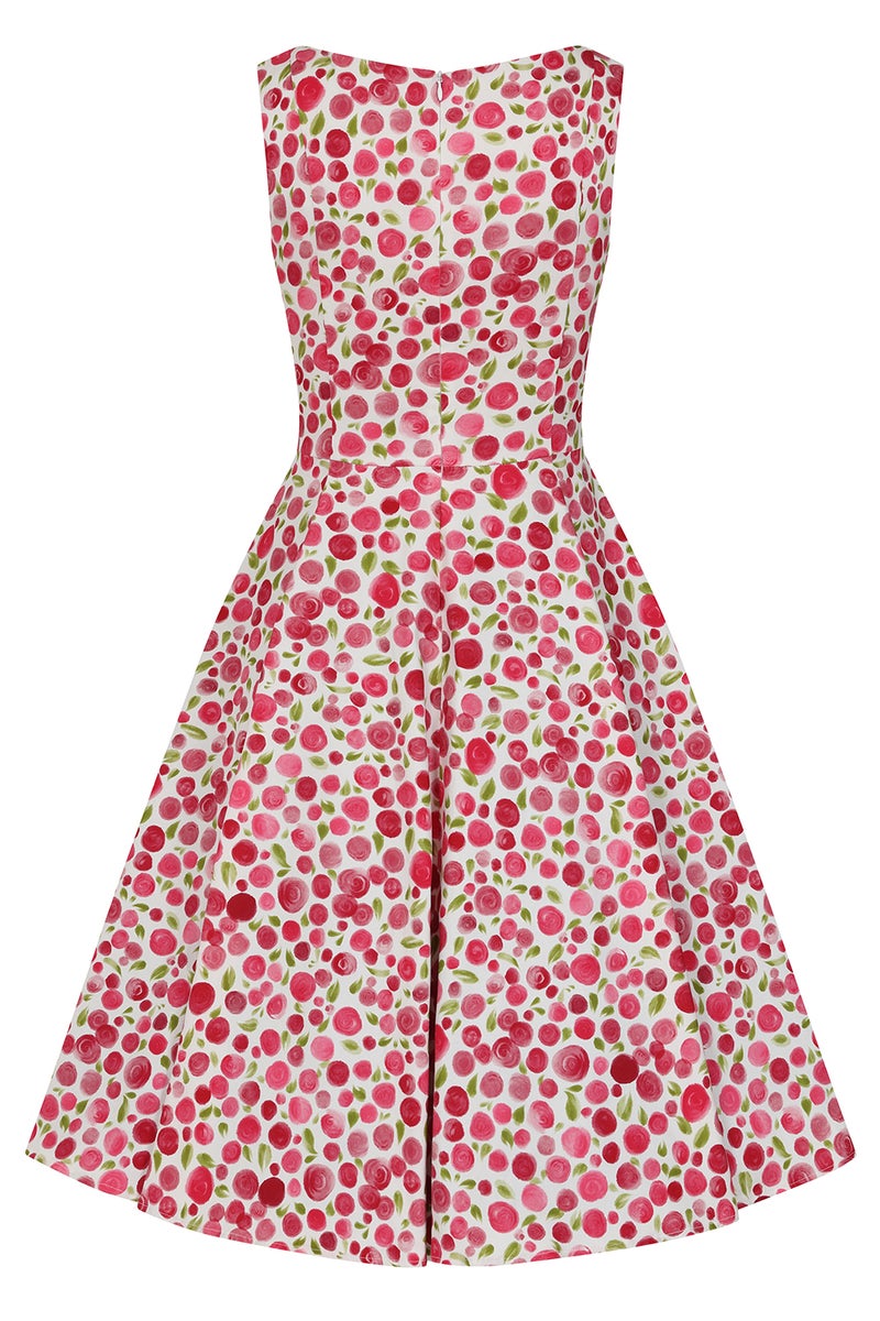 Fresh, playful, and unmistakably feminine, the Rosy Petal Swing Dress brings a burst of joyful charm to your wardrobe. Designed on a crisp ivory base and sprinkled with clusters of soft pink blossoms, this dress captures the sweet romance of springtime in full bloom. The sleeveless fitted bodice features a classic boat neckline and beautifully tailored seams that sculpt the silhouette with subtle elegance. At the waist, the dress flares into a full, flowing swing skirt, delivering that iconic Hearts & Roses London vintage shape and an irresistible swish with every step. Lightweight, flattering, and effortlessly pretty, the Rosy Petal Swing Dress is ideal for daytime occasions, garden parties, and moments when you want to feel beautifully put together.