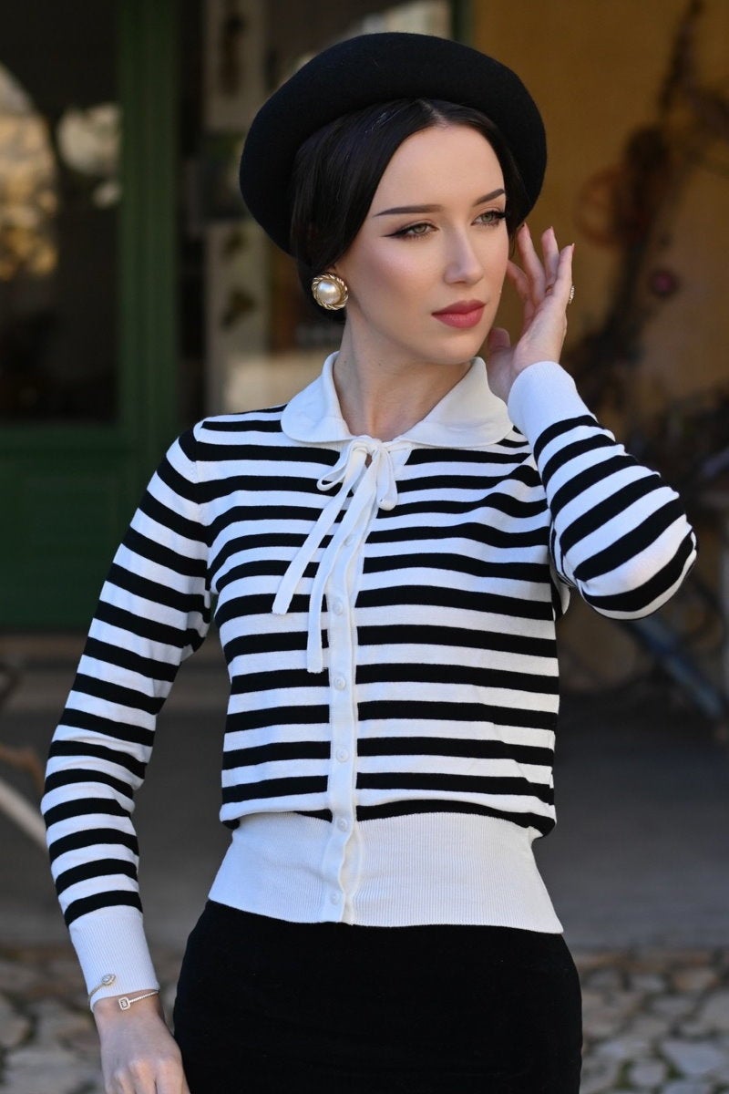 The Monroe Stripe Cardigan is a timeless and elegant choice that beautifully combines classic 1950s spirit with modern comfort. The black and white stripe pattern is an eternal classic, bringing structure and refined vintage charm to any outfit.