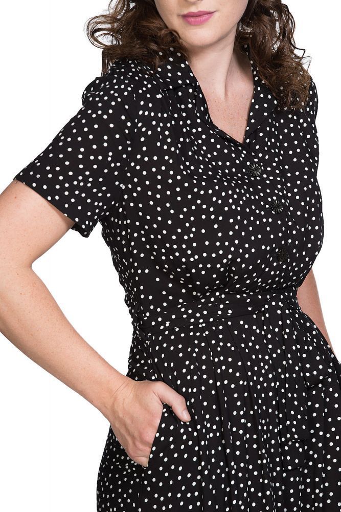 Beautiful 40s style, a-line dress by Banned Retro. Pretty shirt style dress with collars, functional buttons at the front and practical pockets. Belt included. Black dress with small white polkadots. The skirt falls below the knee. Lovely, airy material.