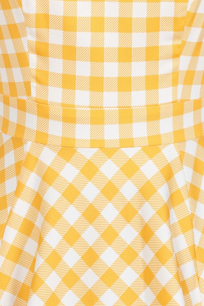 Brighten your wardrobe with the cheerful charm of the brand-new Gemma Gingham Swing Dress! Crafted from a soft cotton blend, this classic dress features a fresh yellow and white gingham print, perfect for sunny days and warm evenings. The boat neckline with a stylish front notch offers a flattering silhouette, while the sleeveless design and fitted waistband accentuate your figure. Hidden back zip and side seam pockets add both functionality and convenience, making this dress as practical as it is pretty. Embrace timeless style and effortless elegance with the Gemma Gingham Swing Dress, a perfect blend of comfort and vintage-inspired flair.