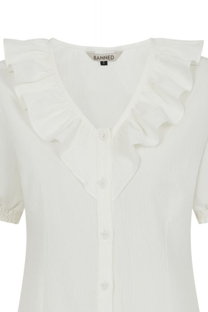 This blouse has a v-neckline, button fastening and there is also a lovely frill detail at the collar. The blouse has short puffy sleeves with elastic cuffs. Cute heart shaped buttons! <3