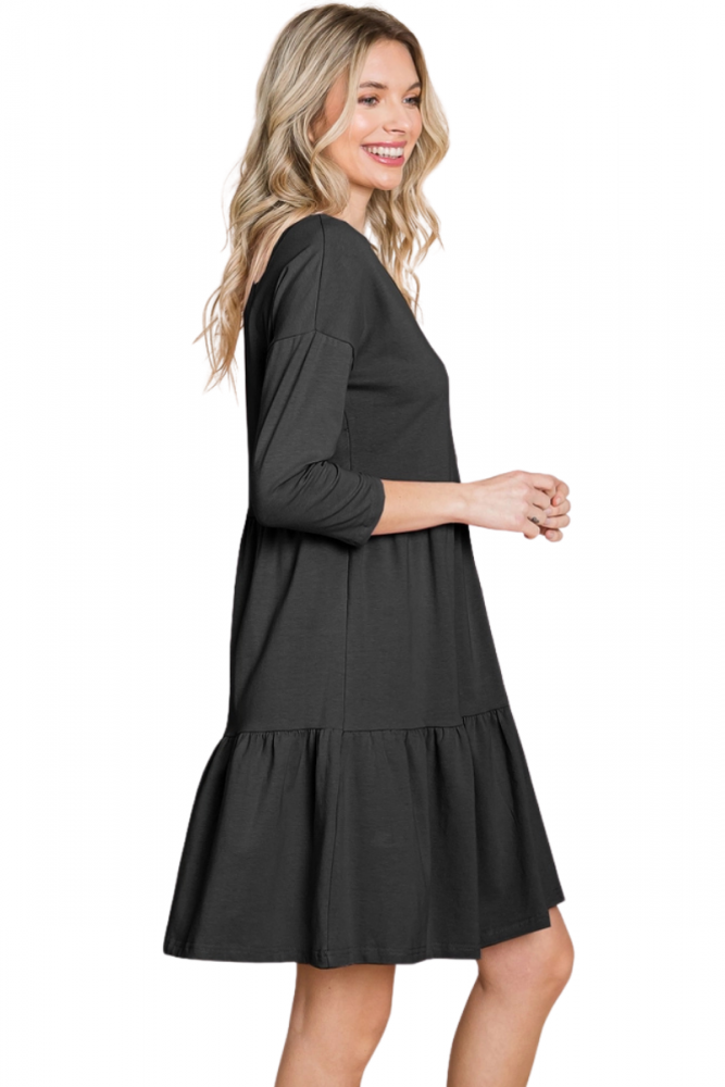 Babydoll style tricot dress. Relaxed style, featuring 3/4 sleeves, decorative buttons at the front, V neck, tiered, layered skirt.