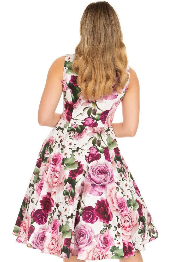 Alice Floral Swing Dress is a stunning beauty. Featuring beautiful pink, purples, greens, and cream coloured blooms and leaves all over. Dress is sleeveless, has a high boat neckline and a high back. A matching bow at the waist adds even more charm! Dress has swing skirt and zips up the side for a flattering fit.