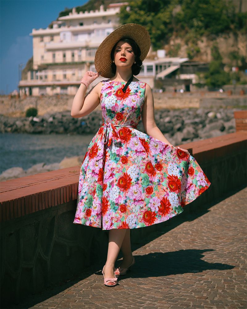 Introducing retro summer style, gorgeous Casey Floral Swing Dress. Bursting with a rainbow of colours and decorated with florals of all kinds, this style is for those who want to stand out from the crowd. The full swing skirt is perfect for dancing all summer long. While the tie belt adds that’s sweet feminine touch. And it has super handy hidden side pockets too!'