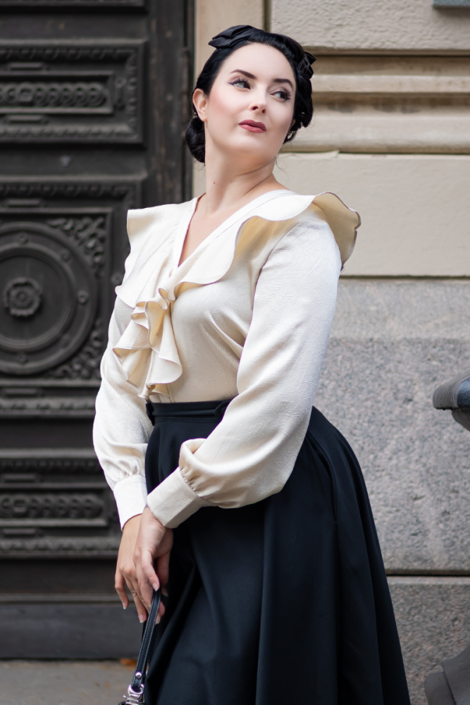 This high waisted swing skirt is like straight from the 50s! The skirt falls below the knees and is made of a nice and heavy material that swings beautifully when you move. Faux buttons at the waist make a lovely little detail to this timeless skirt.