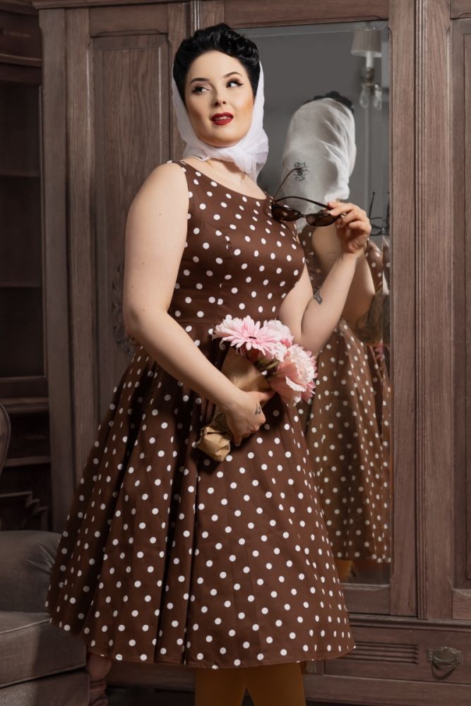 You will feel like a true vintage beauty in this dress! Timeless 50’s polka dot style. Beautiful brown swing dress with lovely white polkadots.