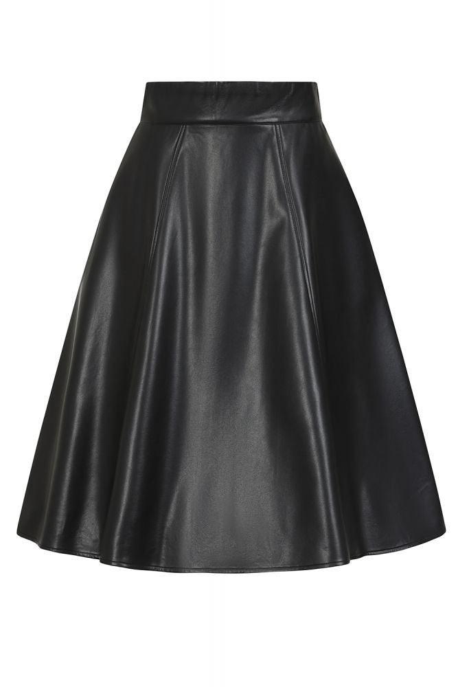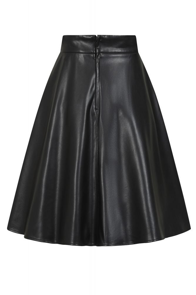 This high waisted a-line skirt. The half swing skirt falls below the knees and is made of matte PU.