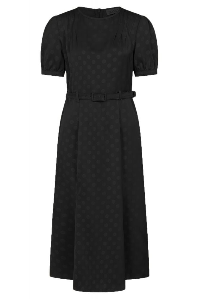 Beautiful and feminine Iris dress, inspired by the 30s. Beautiful trumpet shape hem and short puff sleeves. Lovely satin polkadot material with little bit of shine. Long skirt which falls above the ankles. Belt included.