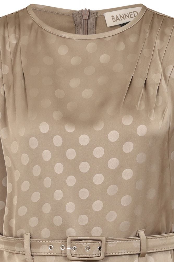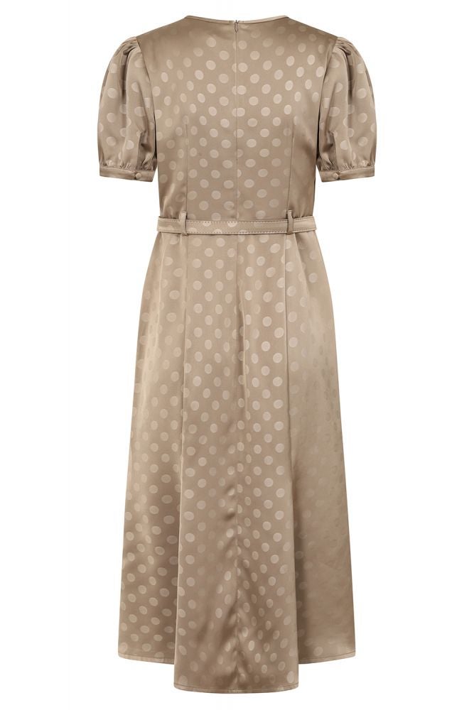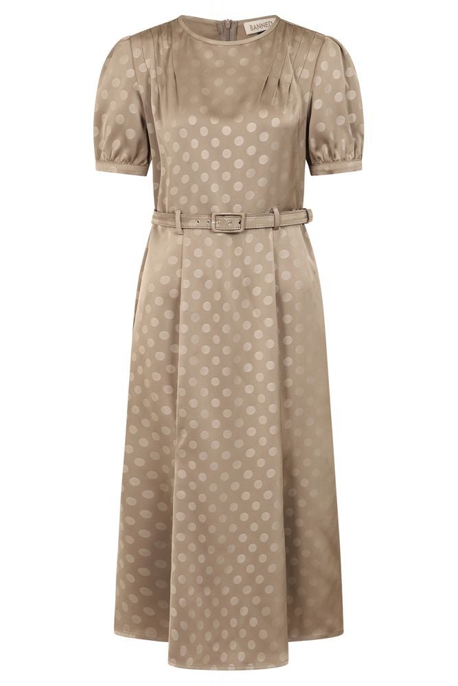 Beautiful and feminine Iris dress, inspired by the 30s. Beautiful trumpet shape hem and short puff sleeves. Lovely satin polkadot material with little bit of shine. The color changes in different lightning from light olive shade to greyish light brown. Long skirt which falls above the ankles. Belt included.