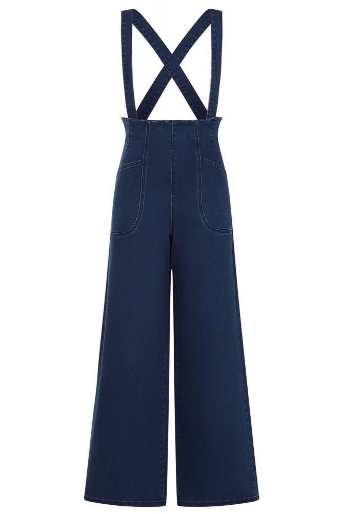 The Jolene Jeans are a pair of high waisted, wide leg jeans. Classic 1940s style. Featuring removable straps that button inside the front and back of the waistband. Front pockets. Made of very comfy, super stretchy denim.