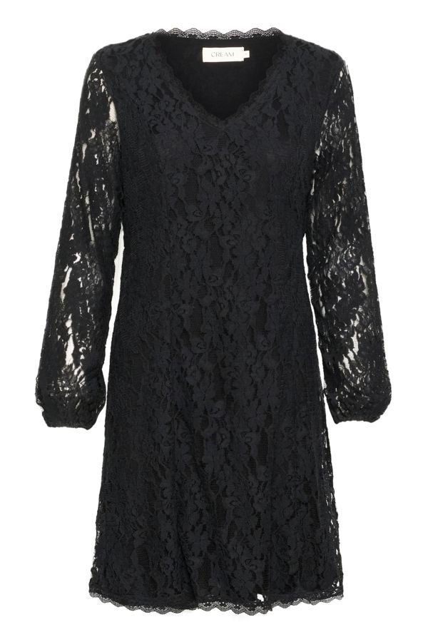 An elegant and timeless black lace dress that enchants with its romantic look. The dress features a flattering V-neckline and long, semi-sheer lace sleeves that add lightness and a touch of sophistication. The dress is lined except for the sleeves, ensuring comfort and ease of wear.
