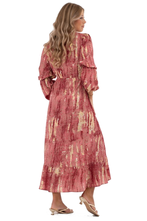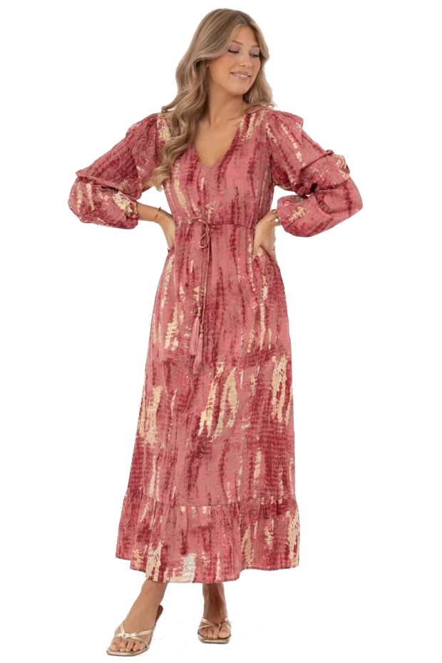 Hilda is a charming summer maxi dress in beautiful shades of pink, enhanced with elegant gold-shimmer and beige details. The V-neckline and flattering waist seam highlight the silhouette, while the front tie detail and elasticated back waist ensure a comfortable and feminine fit.