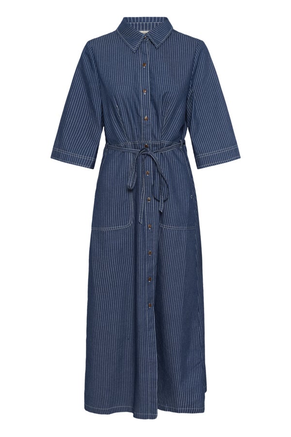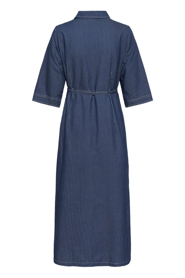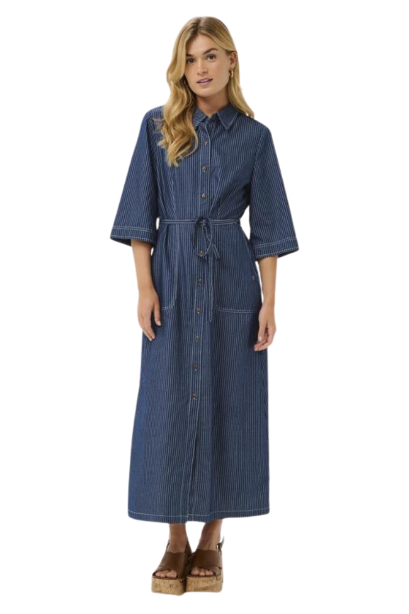 The Cream Agate dress combines a relaxed denim-inspired look with a lightweight and comfortable fabric. The vertical stripe pattern adds a timeless touch, while the midi length makes it easy to style for everyday wear or smarter occasions.